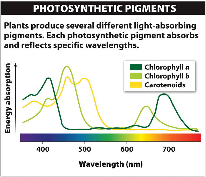 Chlorophyll pigments absorb mainly violet-blue and red light, and reflect green.
