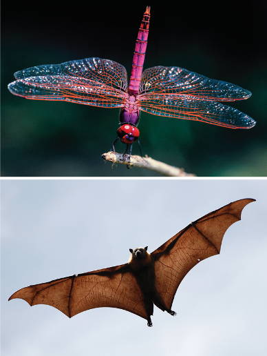 The wings of these flying animals are superficially similar but have different anatomical bases, inherited from unrelated ancestors: insect and mammal.