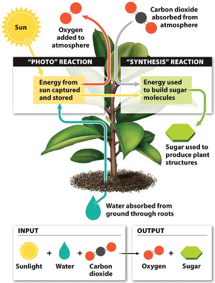 6 CO2 + 12 H2O −> C6H12O6 + 6 O2 + 6 H2O